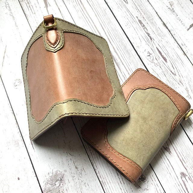 【ジーンズのバックポケットにちょうど収まるサイズ感とアメカジテイスト】…外×内の二色使いだけではなく外側だけで二色楽しめるバイカラーインレイミドルウォレットです。 一見派手な意匠ですが渋めな色合いの二色で落ち着いた雰囲気にまとめています。 一般的にお店で見かける折りたたみ財布はハーフサイズかロングサイズが主流であり、ミドルサイズはなかなか見かけないと思われますが、バックポケットに財布を入れる場合にちょうどよいサイズ感で使えるのがミドルサイズの財布です。 余裕のあるサイズ感なのでパンパンに膨れることなくポケットに収まることも特徴の一つです。 カラーが逆になったバージョンもありますのでショップをご確認ください。 【内装】 札入れは仕切りはなく1室のみです。内装パーツと外装パーツのつなぎ合わせに工夫があり、がばっと大きく開く余裕のある作りになっています。 開いて左側に4段のカードポケット、その裏に大きめのポケットを配置しています。 右側にはやや大きめの小銭入れと、その裏にやはり大きめのポケットを配置しています。 【外装】 インレイと呼ばれる、内側をくり抜いて別の革(素材)を入れ込む手法を採用し、個性的な見た目に仕上げています。 一般的には別の革や布などでインレイしますが、本製品は同種の革の色違いでインレイを施しているため「シビラリスシオ」という蠟引きイタリアンレザーのエイジングを存分に楽しめる作りとなっております。 背上部に真鍮製のDカンを装備しておりウォレットロープやウォレットチェーンをつなぐことができます。 【革について】 ブラウンの革グリーンの革どちらもイタリア産のシビラリスシオという高品質な牛革です。 表面にロウが塗ってあり白くかすみがかったような表情の革ですが、使用していくにつれロウが取れたり革の内側に溶け込んだりして地の革色が現れます。経年変化(エイジング)が期待できるタンニンなめしの革で、色が濃く艶が増すように変化します。硬めのハリとコシのある革です。 革表面にうっすらと血管の筋や生きていた時についた傷や皺などが染色の色ムラとして表れている場合があります。あまりにも大きな不具合箇所は除外して制作していますが、このような小さなブレがあった場合でもそれは革の生きた表情として楽しんでいただきたいと考えております。 【仕様】 サイズ(閉じた状態):縦約13.9cm、横約9.5cm、厚さ約2-2.5cm 革:タンニン鞣し イタリア産牛革 シビラリスシオ 茶、緑 糸:オリーブグリーン ホック:ニッケル(カラー:ゴールド) Dカン:真鍮製 仕立て:総手縫い <作品のこだわり 手縫いの縫い目> 適度なバランスの距離で縫い穴と縫い穴の間を糸目が走る、斜めの平行が美しく並ぶステッチラインを追求しています。 <作品のこだわり コバ(革の断面)の仕上げ> 革本来の風合いを保ちながらつるつるな手触りかつギラギラしすぎない適度な輝きに仕上げています。 <作品のこだわり 屋号の刻印> 当店「bersiar-siar (バーシアシア)」は、ブランドロゴを前面に押し出さずにひっそりと目立たない箇所に刻印しています。 <パッケージ> 不織布でアイテムを包み、カットペーパー緩衝材と厚紙ボックスのパッケージングが標準となります。 ※「革」になる前の「皮」の状態で存在しているキズや血筋などに対する隠蔽力が高く均一な仕上がりなのがクロム鞣しです。対して本製品の革は、それら自然由来の状態が風合いとして表面に現れやすいタンニン鞣しであり、そのタンニンゆえに色や艶などが徐々に変化していく「育っていく」革となっております。 ※濡れた手で触った直後の本製品を白い衣服でこすると色移りする可能性がありますので水分には注意してください。 ※手で触ることの多い財布には本来オイルメンテナンスはほぼ必要ないと思いますが、曲げ伸ばしの多い箇所などがガサガサしてかさつくことがあれば革製品用のオイルやクリームを使用したメンテナンスをお勧めします。