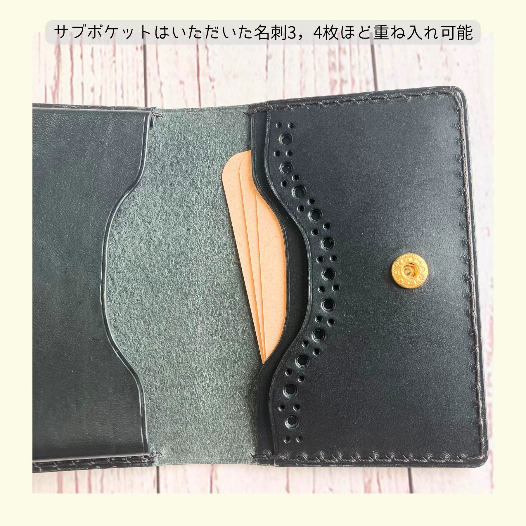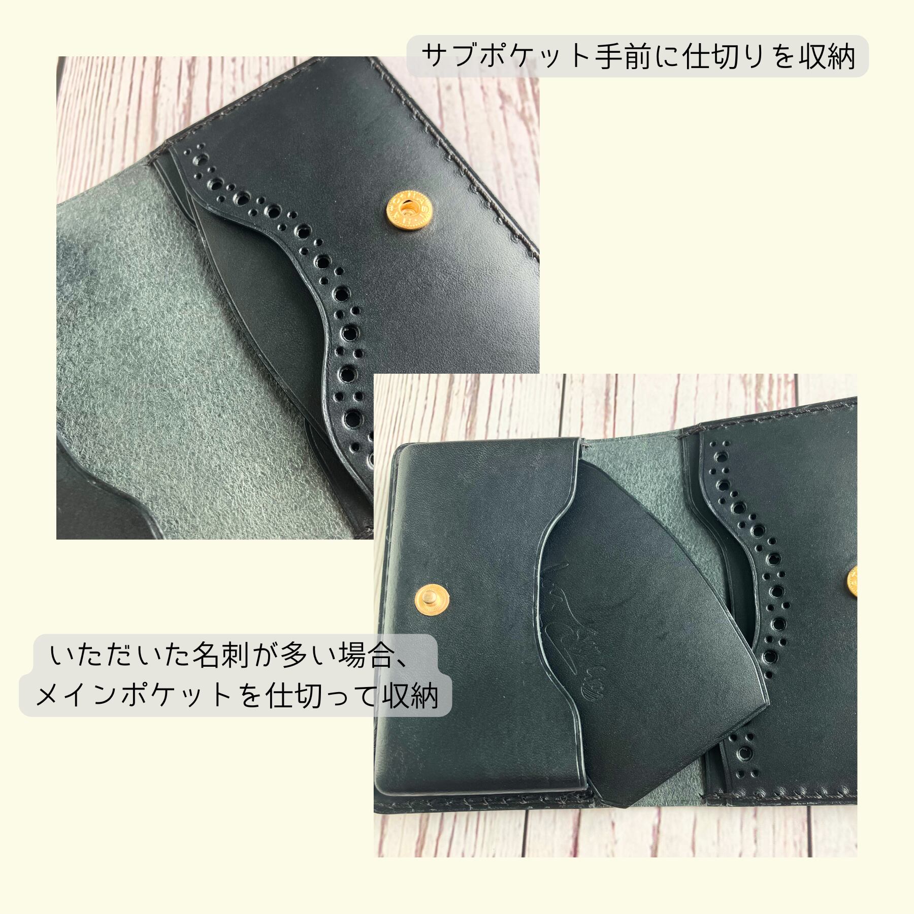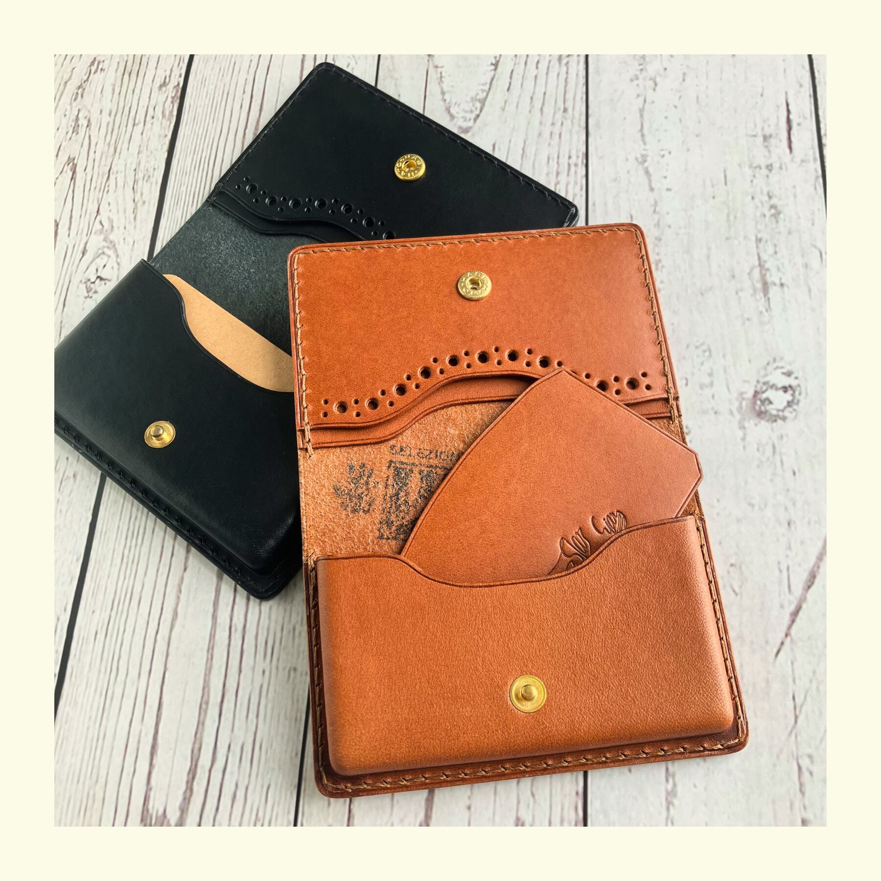 【革靴好きな方の目を引くかもしれない】 - チラっと見えたブローグ装飾が名刺交換時の会話のきっかけになる…かもしれない!? という妄想をもとに仕立てた名刺入れとなります。ジャケットの内ポケットから取り出すようなビジネスシーンにもマッチするよう極力シンプルな外見ですが、開くと一方はウェットフォーミングで形作ったポケット、もう一方には革靴の装飾技法であるブローグが施された、少しアクセントの効いたアイテムです。