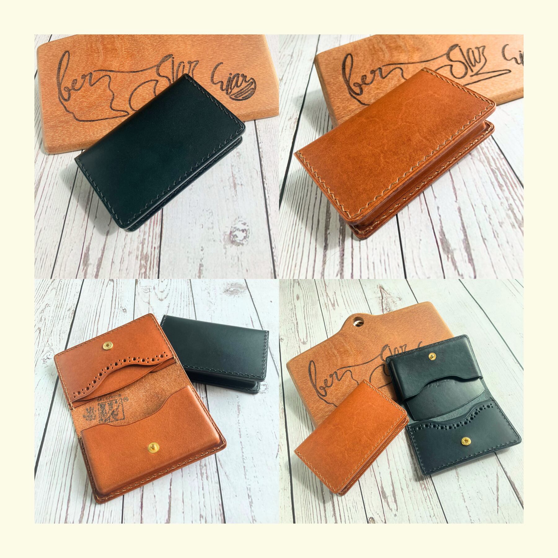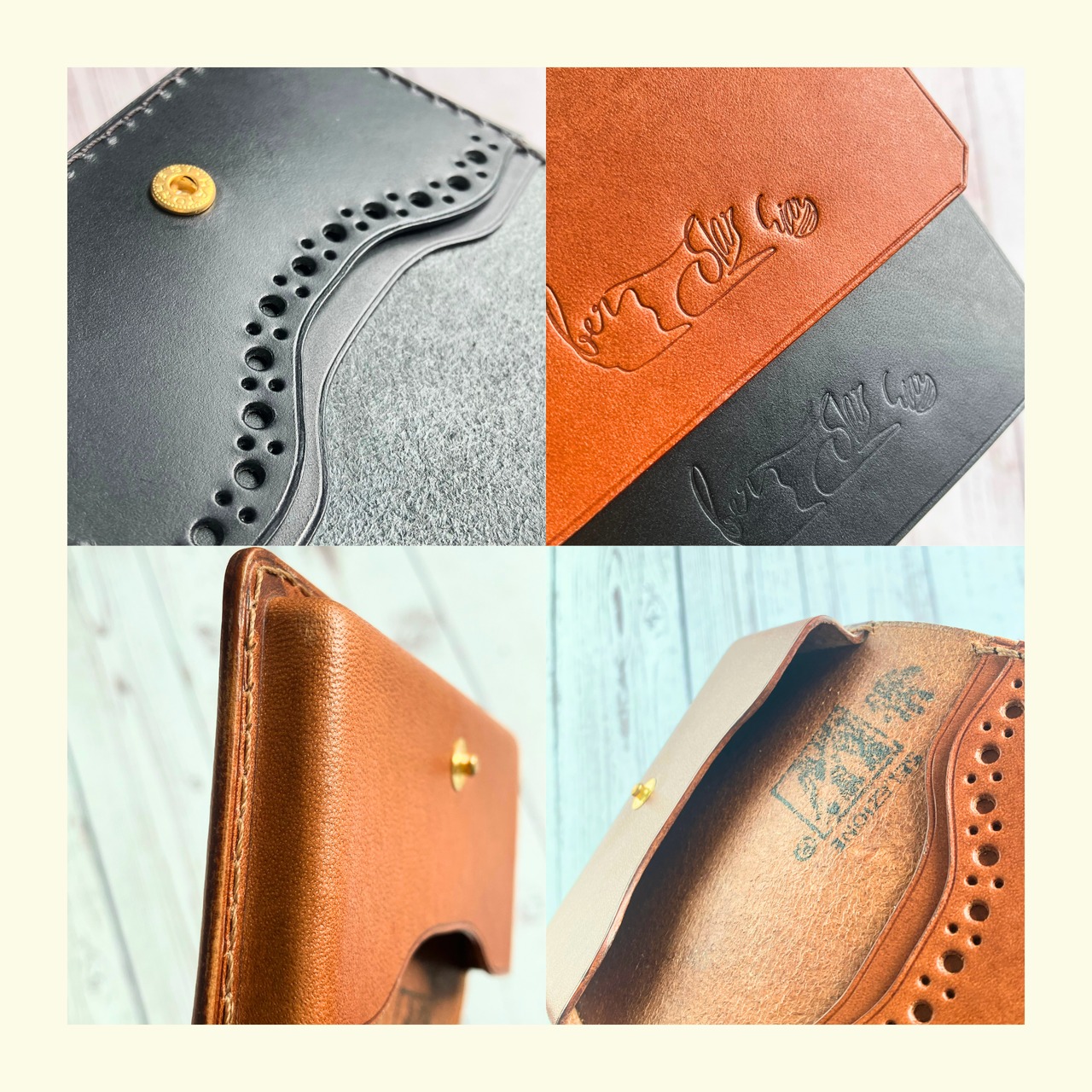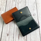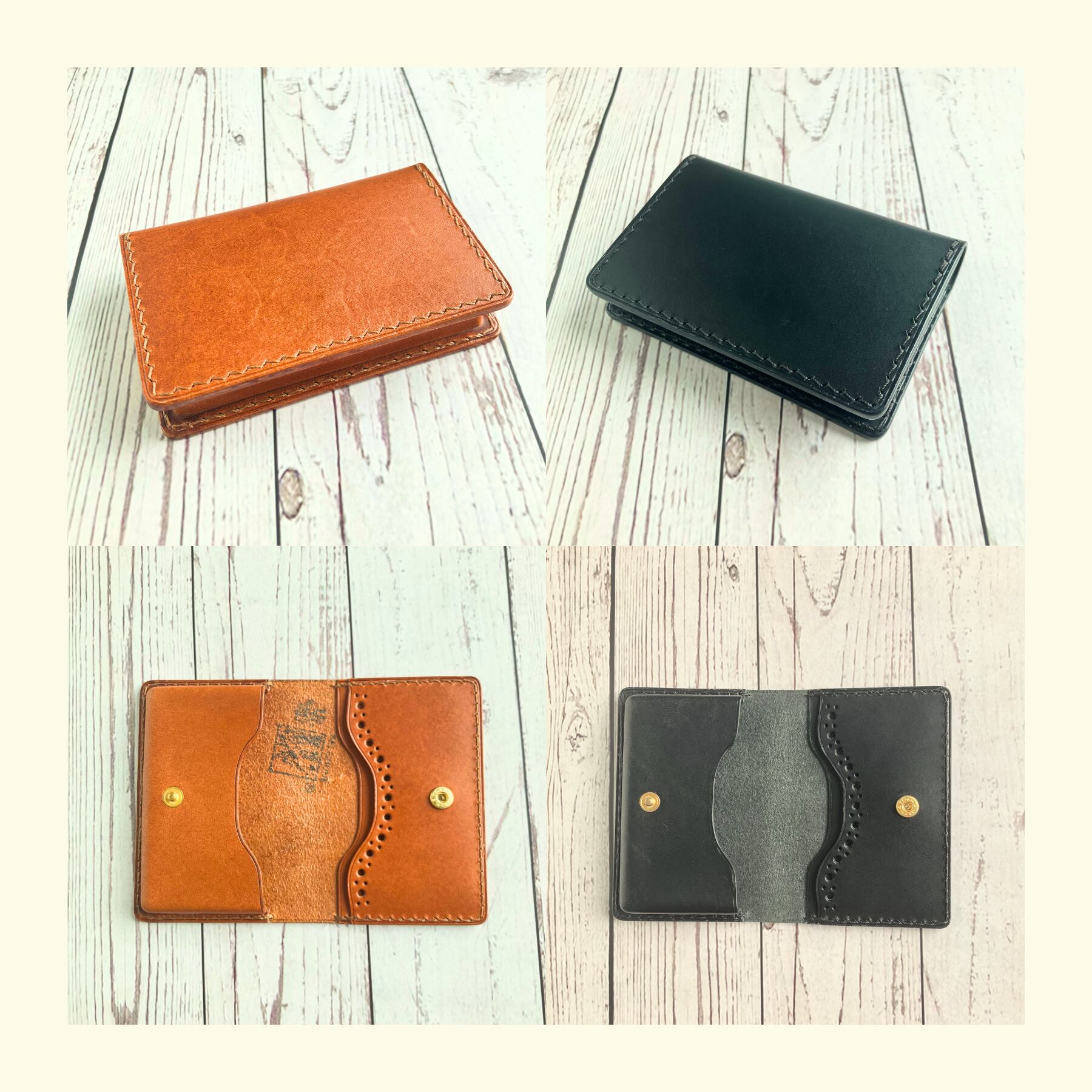 【革靴好きな方の目を引くかもしれない】 - チラっと見えたブローグ装飾が名刺交換時の会話のきっかけになる…かもしれない!? という妄想をもとに仕立てた名刺入れとなります。ジャケットの内ポケットから取り出すようなビジネスシーンにもマッチするよう極力シンプルな外見ですが、開くと一方はウェットフォーミングで形作ったポケット、もう一方には革靴の装飾技法であるブローグが施された、少しアクセントの効いたアイテムです。