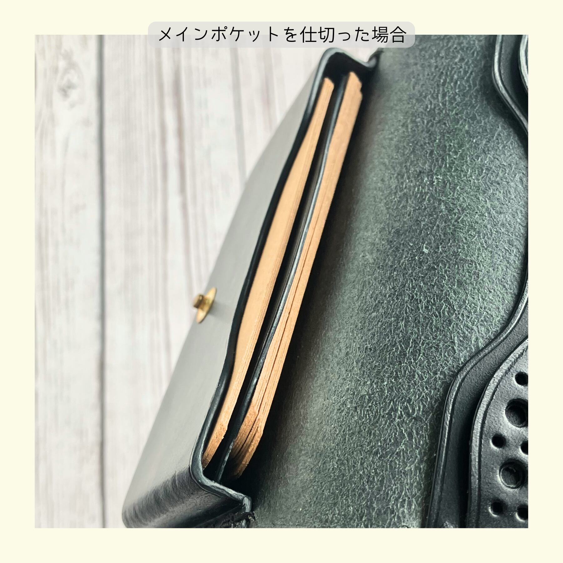 サブポケットの前面には、ブローグと呼ばれる革靴に用いられる穴飾りが施されたポケットが配置されています。ホックの裏側には薄い革を張り付けて保護してありますが、ここを名刺ポケットとして利用しますと金具の跡がつくかもしれませんのであまりお勧めしません。仕切りを使わない時にここに収めておくことをお勧めします。