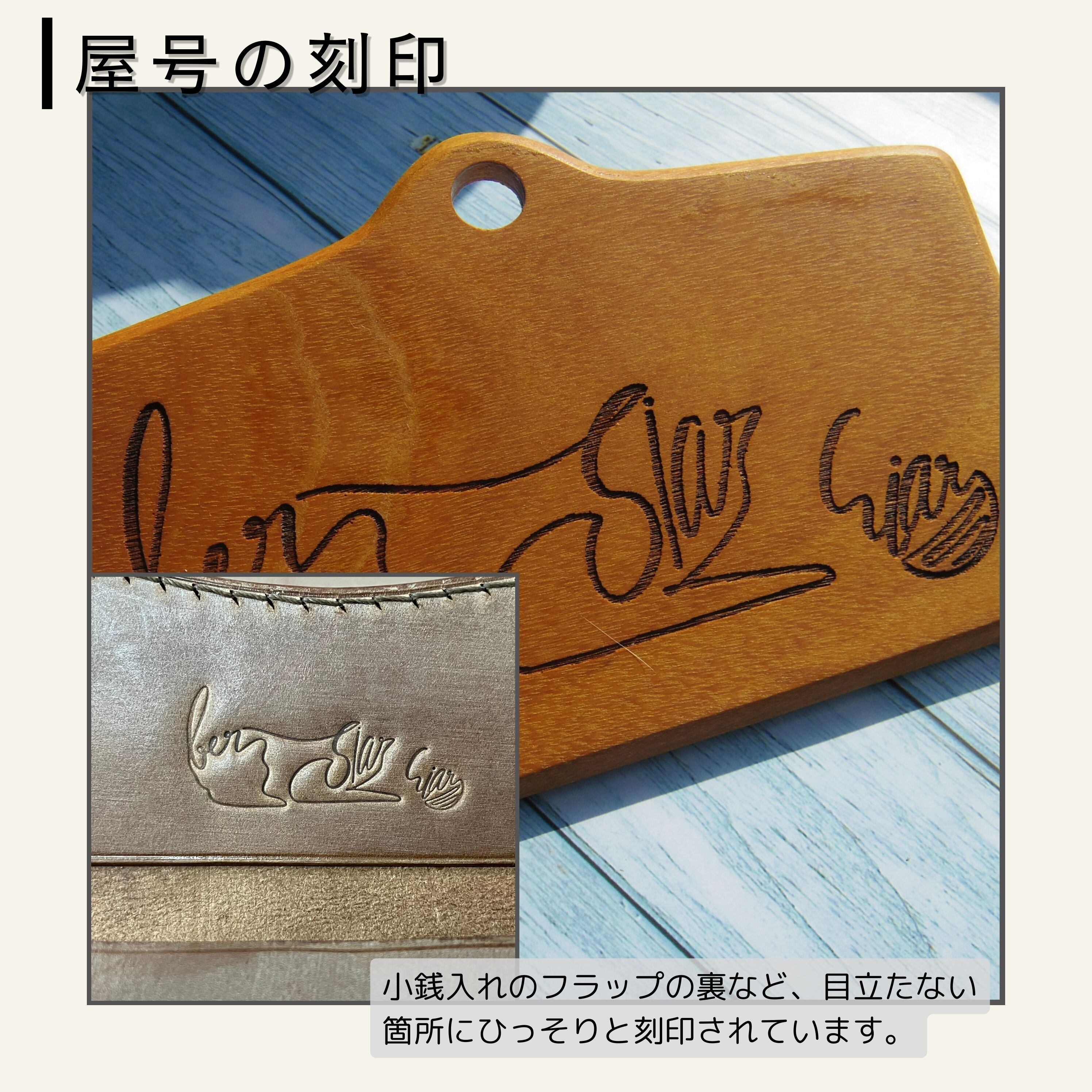 ブラウンだけ、タンナー(皮から革にする業者)が革一枚につき裏に一つだけ押すスタンプをトリミングした構成にしています。メインポケットの内側に面積を示すスタンプも隠れています。これによりブラウンは少しだけカジュアルな印象の名刺入れとなっています。