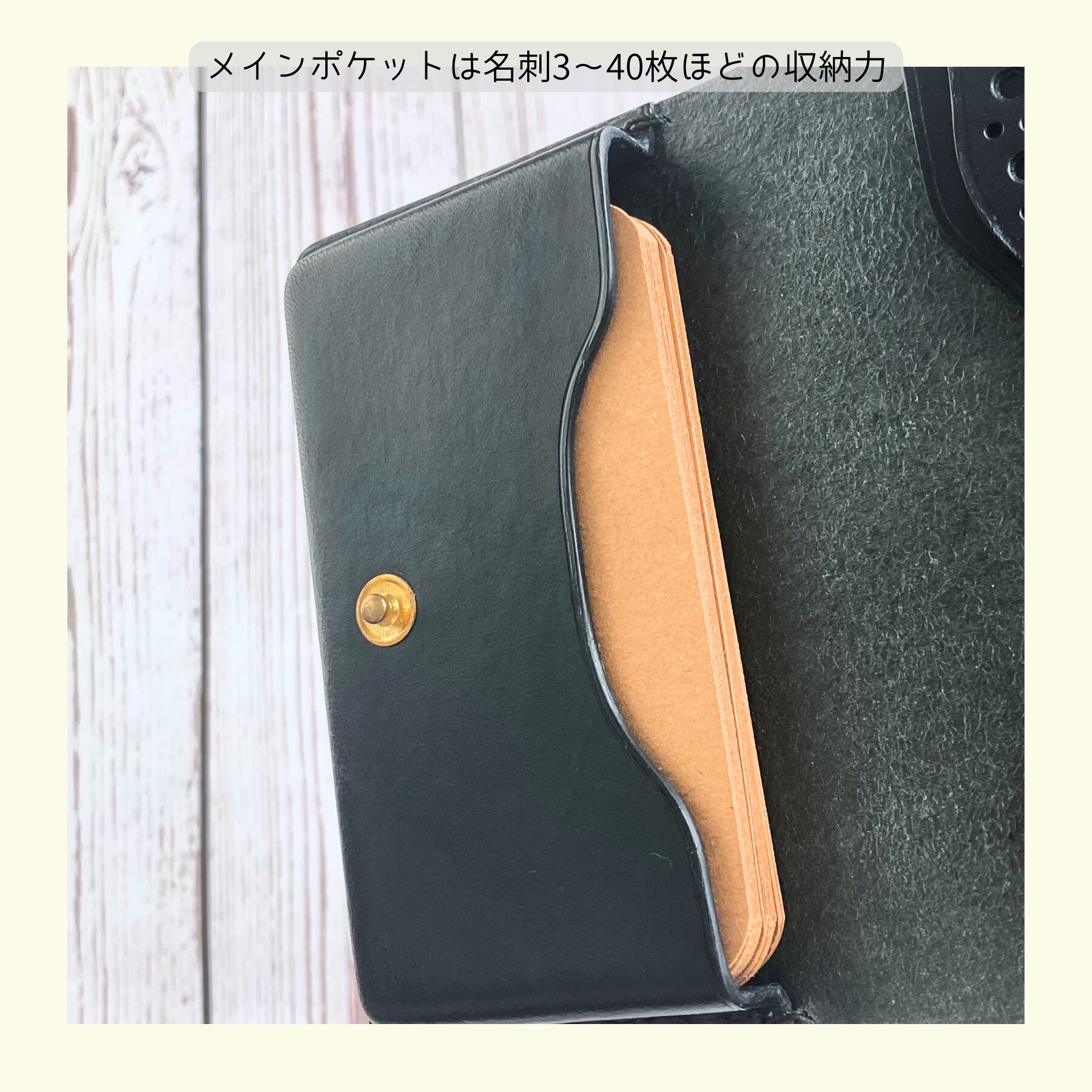 【サブポケット】いただいた名刺を一時保管するための用途として、3,4枚ほど重ねて保管可能です。メインポケットに比べると深めのポケットとなりますが、これはいただいた名刺をできるだけ広範囲でカバーして傷を付けないための構造です。ホックはこのポケットより前面の革に取り付けてあるため、ホック裏の金具の跡が名刺に付くことはありません。