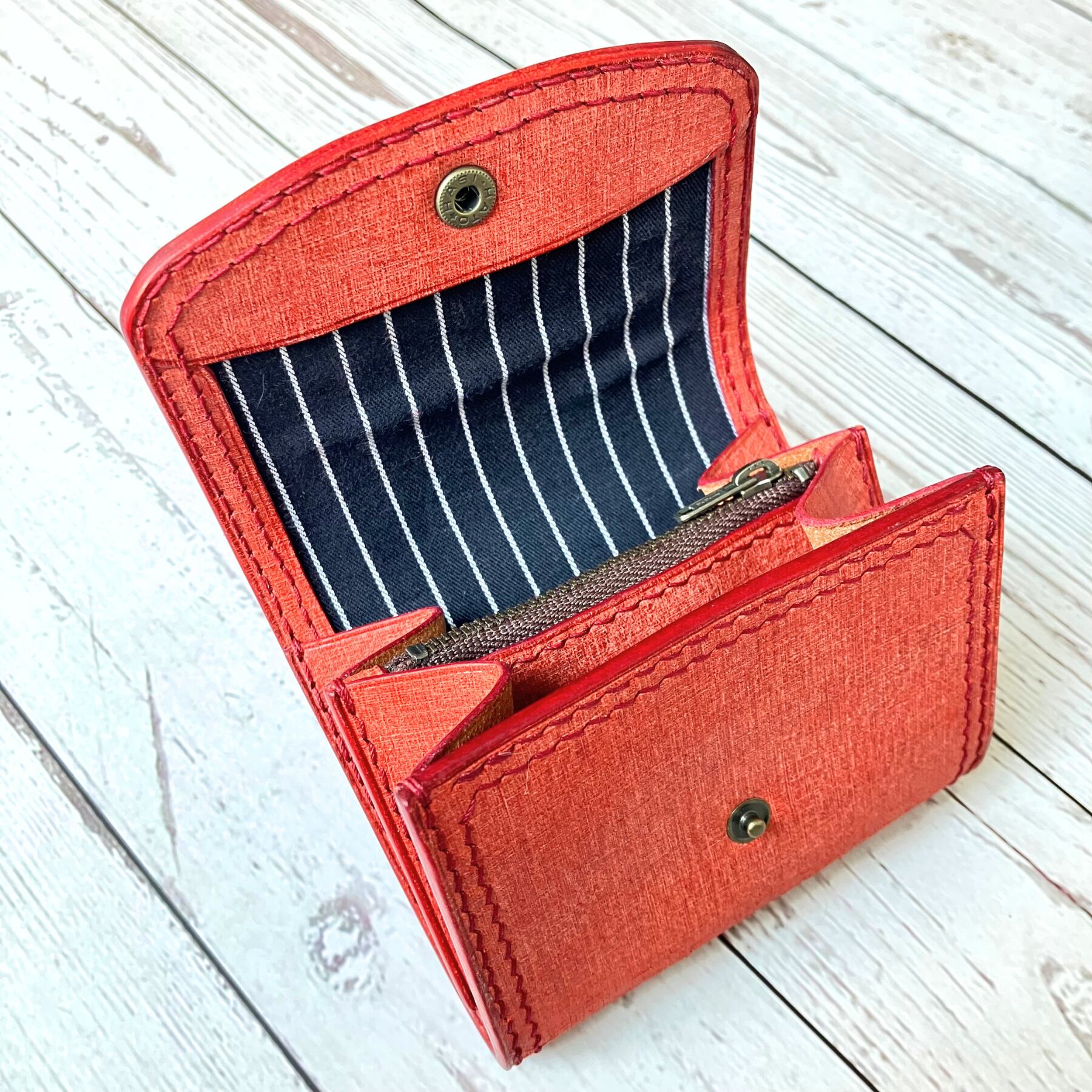 【カード数枚と予備のお札をざっくりと放り込むだけ】 - ”フル装備の財布を持っていくほどではない”、”ちょっとそこまで” という用途にピッタリなコンパクトでシンプルな革財布です。多機能ではなく"少機能"ですが、裏地にドイツ製古着の織柄ストライプ生地を用いつつ二重のステッチを施した一風変わった印象に仕立てております。