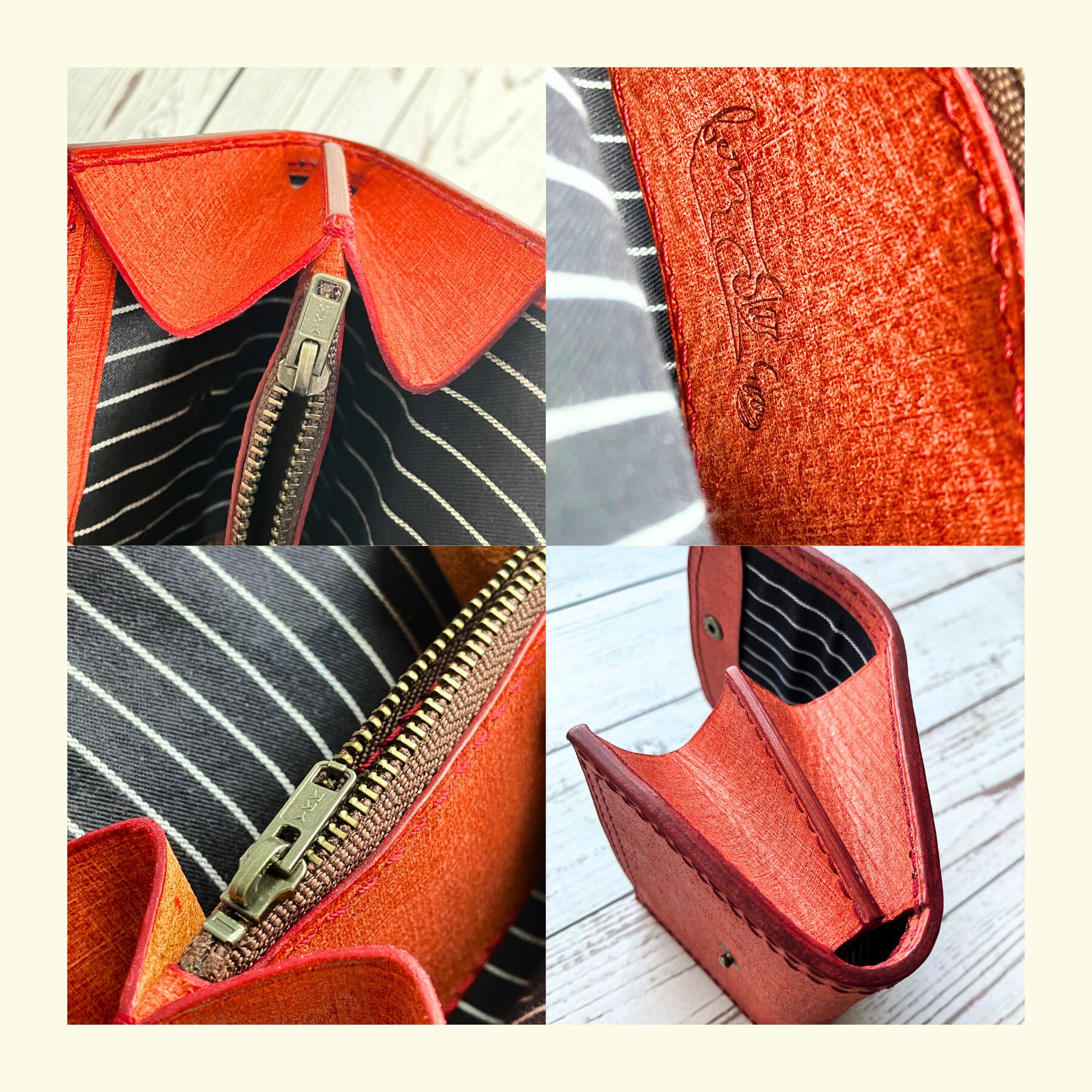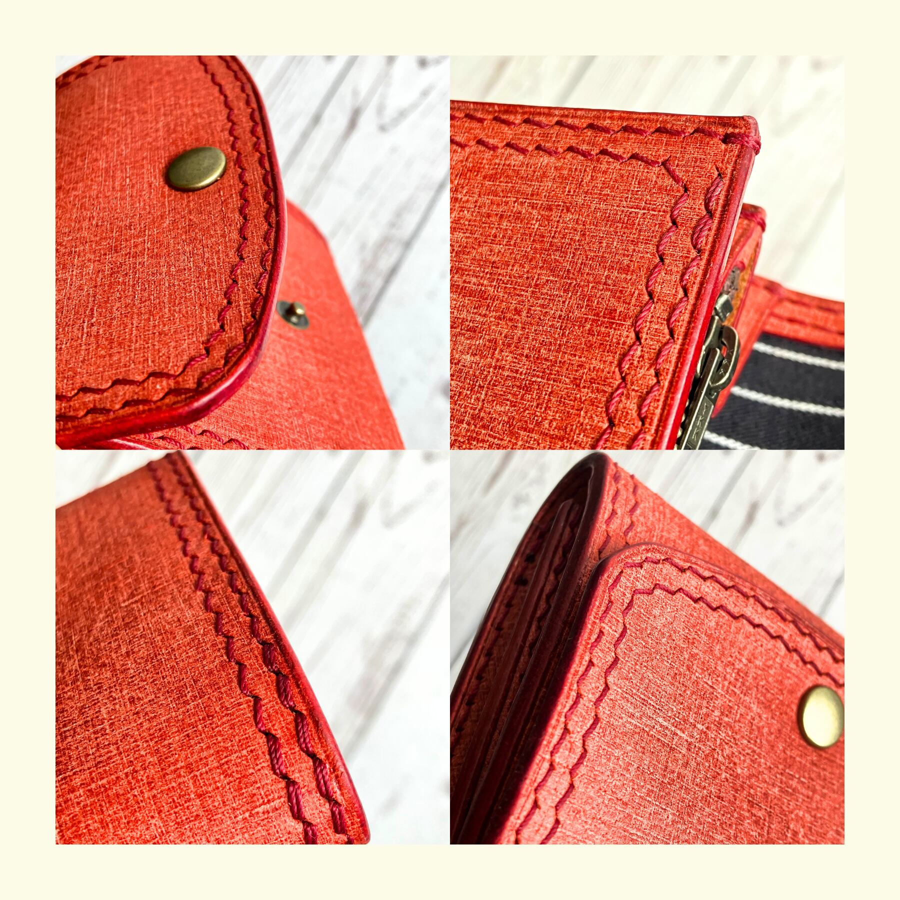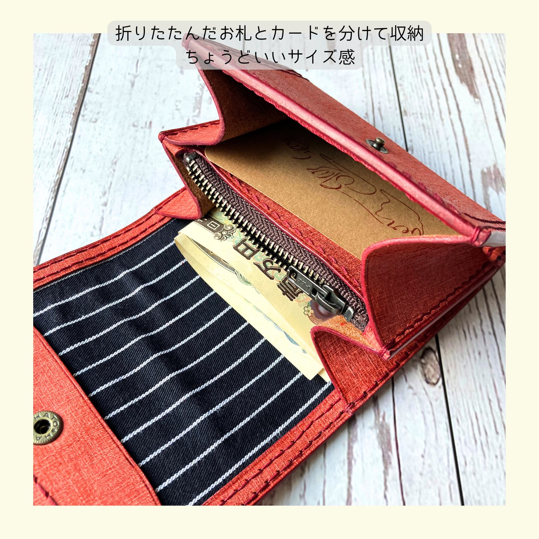 コバ(革の断面)は全て水性染料による赤染め仕様です。
