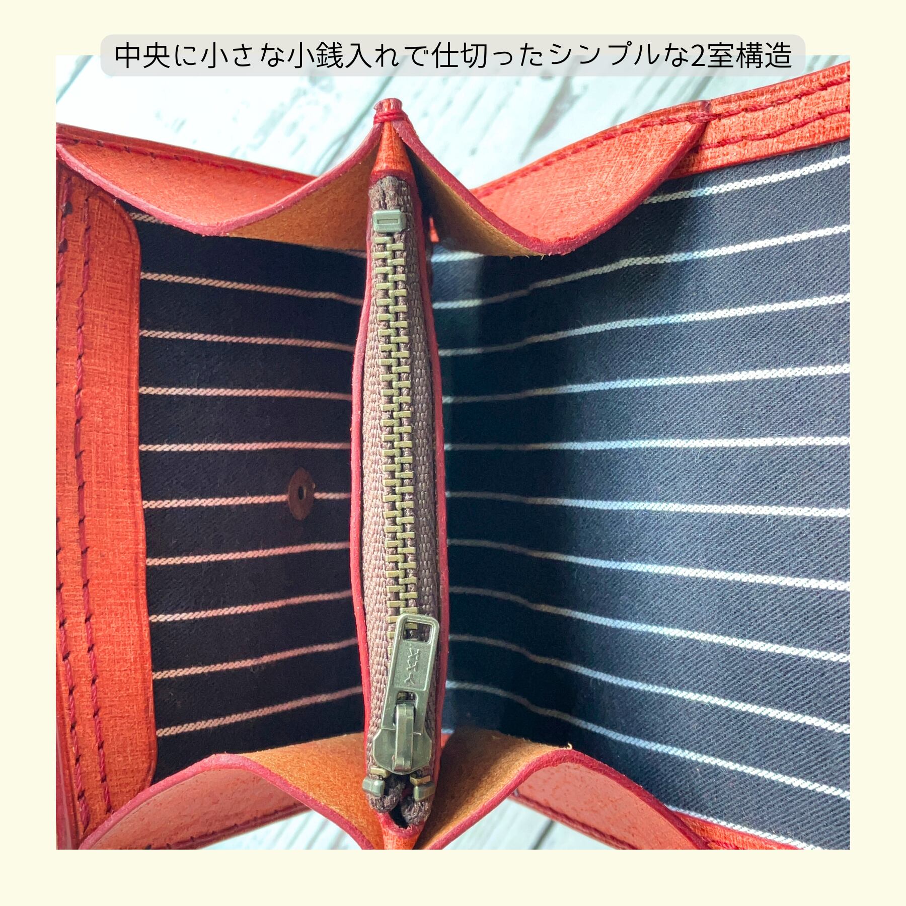 フラップを開くと札入れもカードポケットもない、カードや折りたたんだお札をざっくりと放り込んでおくスペースが2部屋あるというだけのシンプルな構造です。2部屋の中央の仕切りは、数枚のコインを一時保管しておく程度の小さなファスナー小銭入れとなっております。