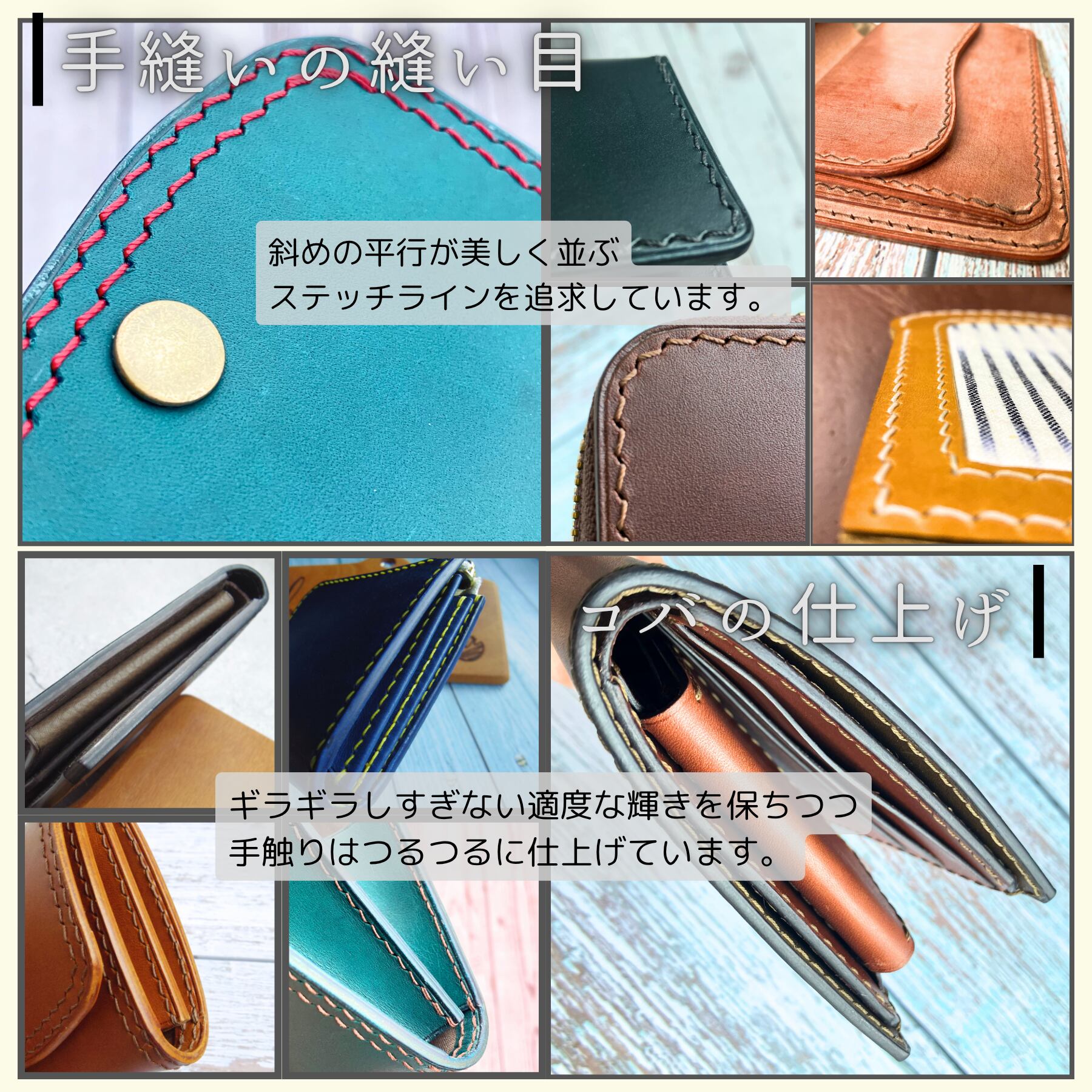 革本来の風合いを保ちながらつるつるな手触りかつギラギラしすぎない適度な輝きに仕上げています。